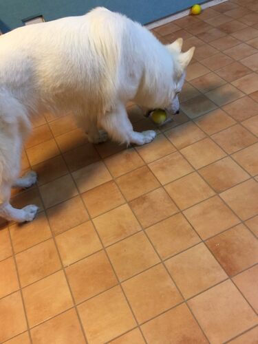 アド兄のボールを横取りしてみたマギーちゃん。 同じ色のボールが向こうに転がっているのに アド兄のがいいんだって( ̄▽ ̄) アド兄が返してくれよ~( ;´Д`)って言うのを待ってる。 アド兄母ちゃんに訴えてる(*_*) 見せびらかすもアド兄にムシされるマギー…